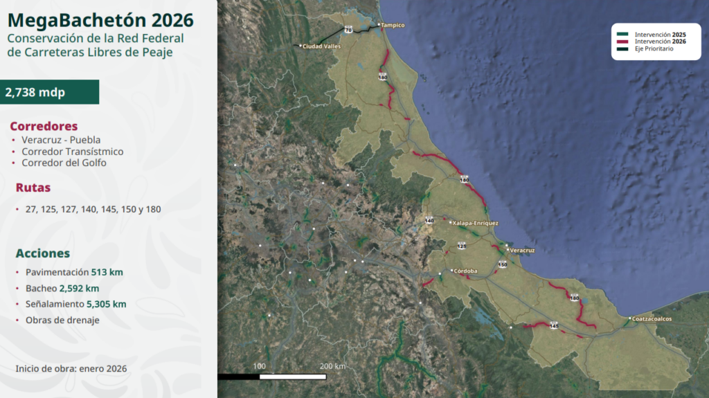 Como parte de los trabajos para la reconstrucción invertirán cuatro mil 319 millones de pesos para realizar 50 acciones en 426 kilómetros de la Red Carretera Federal Libre de Peaje. Así como para 35 acciones en 287 km y la intervención de 18 puentes. Entre las que están 11 construcciones en Xoxocapa, Misantla–Sarabia, Zontecomatlán, Embocadero, San Gregorio, San Isidro, Pino Suárez, Tetzacual, Plan del Encinal, Atempa y Chijolar. Y seis ampliaciones de claro en El Aguacate Terrero, Horcones–Alazán, El Limonar, El Palmar Prieto, Buenavista y Oxitempa; y una rehabilitación en La Carolina. Las obras, indicó, iniciarán a partir de febrero de 2026.