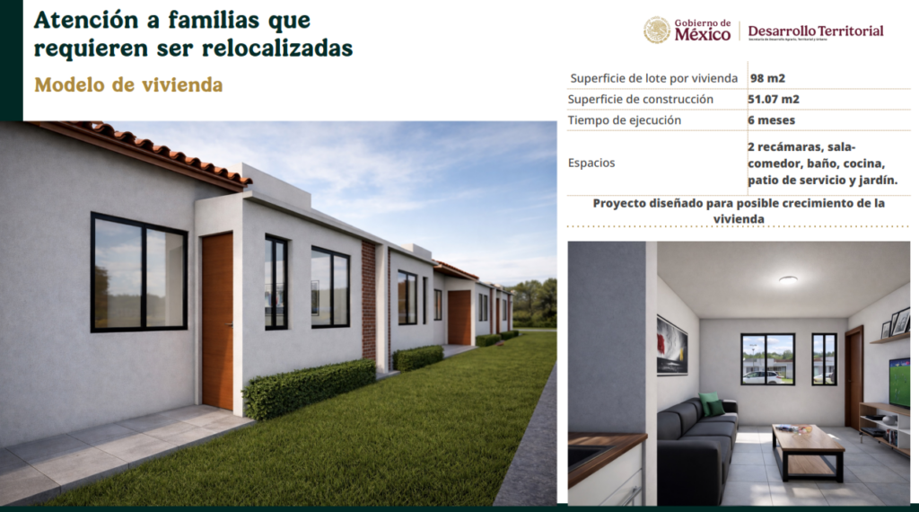Finalmente, la titular de la Secretaría de Desarrollo Agrario, Territorial y Urbano, Edna Elena Vega Rangel, compartió que, a través del censo realizado por la Secretaría del Bienestar, identificaron 33 mil 857 viviendas con daños mayores o totales. De los cuales, ubicaron cuatro mil 60 familias, de 31 localidades, que deben ser relocalizadas. Para ello, ya tienen siete predios para la relocalización, donde se construirán modelos de vivienda en lotes de 98 metros cuadrados. Entre los espacios destinados a la relocalización está un lote donado por un privado, donde se construirán tres mil 500 viviendas tipo duplex.
