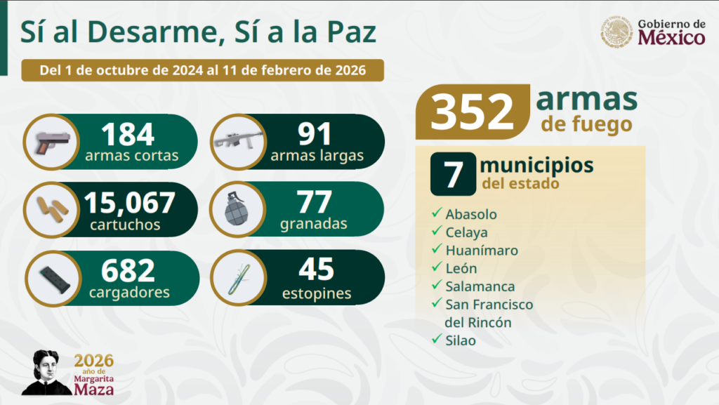 El titular de la Secretaría de Seguridad y Protección Ciudadana, Omar García Harfuch, detalló que, en Guanajuato, a través de la Estrategia Nacional de Seguridad, del 1 de octubre de 2024 al 15 de febrero de 2026, detuvieron a cuatro mil 400 personas por delitos de alto impacto y aseguraron seis mil 400 armas de fuego, más de cinco toneladas de droga, incluyendo mil pastillas de fentanilo. Además, desmantelaron un laboratorio para la producción de metanfetaminas. De igual manera, con la Estrategia Nacional contra la Extorsión, del 6 de julio de 2025 al 31 de enero de 2026, detuvieron a 16 personas, entre ellas siete objetivos prioritarios.