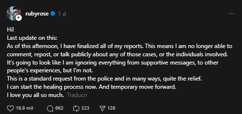La modelo y actriz, Ruby Rose, declaró que ya presentó todos los informes requeridos ante la policía, lo que la inhabilita para hablar públicamente sobre el caso. “A partir de esta tarde, finalicé todos mis informes. Esto significa que ya no puedo comentar, volver a publicar ni hablar públicamente sobre ninguno de esos casos o los individuos involucrados”, escribió Rose en Threads, pidiendo respeto por el proceso legal.