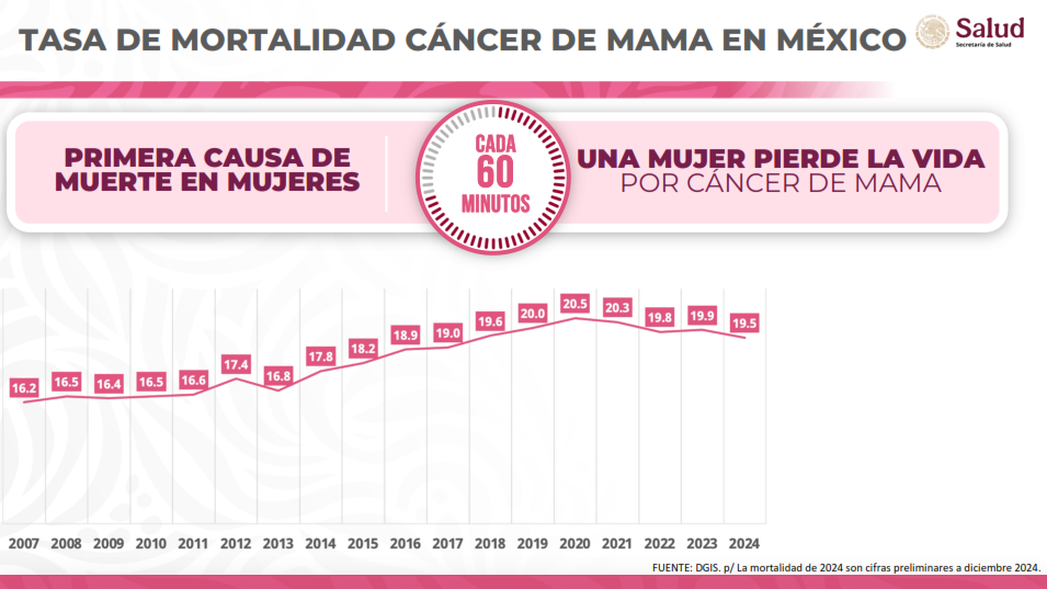 La población en riesgo, por cáncer de mama, es de 25.5 millones de mujeres mayores de 40 años. Y, aproximadamente, cada hora muere una mujer por cáncer de mama.