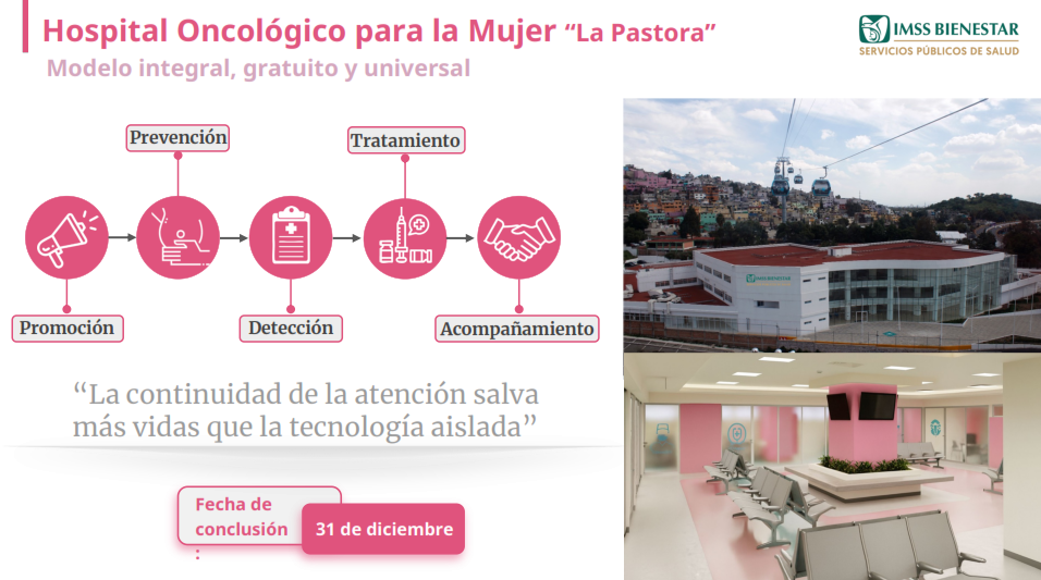 La jefa del Ejecutivo federal indicó que se trata de un compromiso del Gobierno de México con las mujeres para atender de manera integral dicha enfermedad con una inversión de ocho mil mdp. La mitad de dicho monto la destinará el Instituto Mexicano del Seguro Social a sus derechohabientes y la otra mitad, el Gobierno de México, a través del IMSS Bienestar y del Instituto de Seguridad y Servicios Sociales de los Trabajadores del Estado (ISSSTE).