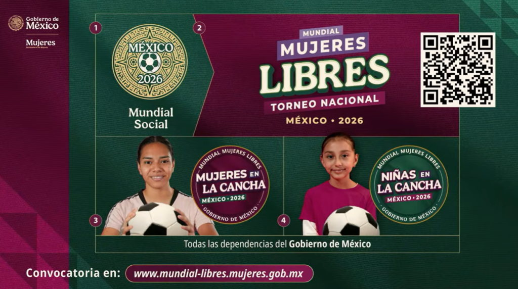 La titular de la Secretaría de las Mujeres, Citlalli Hernández, anunció el Torneo Nacional Mundial Mujeres Libres. La convocatoria se publicará el 9 de febrero en la página de la dicha Secretaría, y el registro será del 2 al 15 de marzo, mientras que la gran final se jugará el 24 y 25 de octubre. Además, en los Centros LIBRE para Mujeres impartirán cursos y talleres relacionados con el tema deportivo.