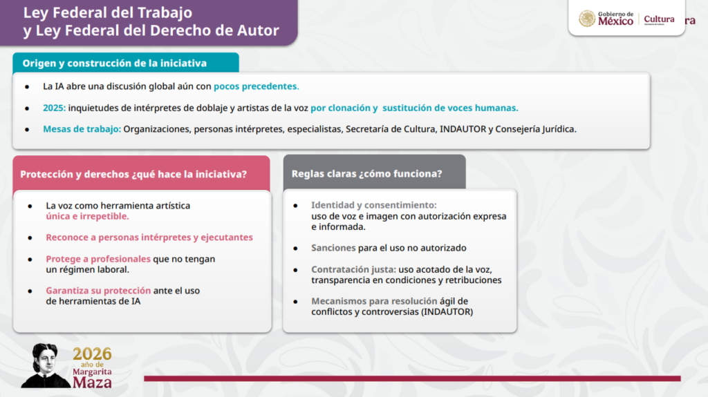 Sobre la reforma a la Ley Federal del Trabajo y a la Ley Federal de Derecho de Autor, indicó que se reconoce la voz humana como una herramienta artística, única e irrepetible. La cual forma parte de la imagen de la persona y cuyo uso requiere autorización expresa e informada ante el uso de herramientas de Inteligencia Artificial (IA). Se establecen reglas claras como: