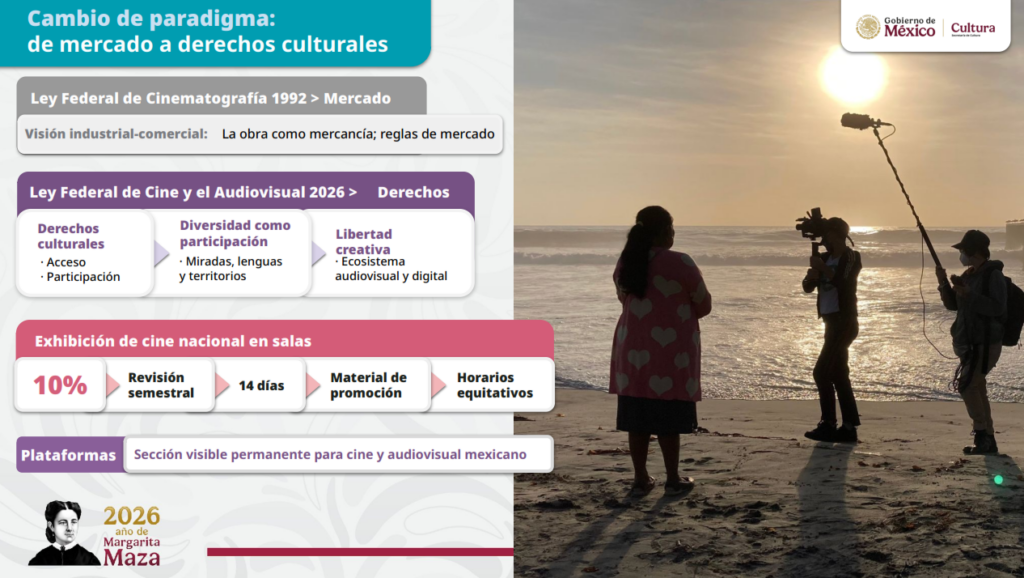 La titular de la Secretaría de Cultura, Claudia Curiel de Icaza, indicó que la iniciativa de Ley Federal de Cine y el Audiovisual, que actualiza la ley vigente de 1992, amplía el ecosistema para incluir a las plataformas. Así como también propone: