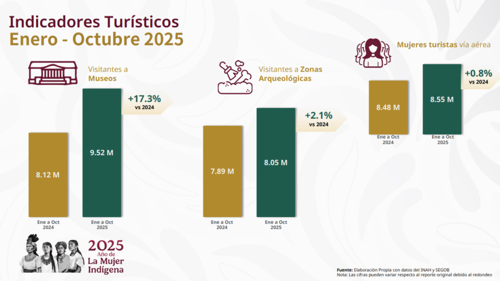 Además, el porcentaje de pasajeros internacionales del Tren Maya creció 181 por ciento, ya que transportó más de 75 mil personas de otros países. En cuanto a visitantes a museos, este indicador incrementó 17.3 por ciento; en las zonas arqueológicas 2.1 por ciento y como reflejo de que en México es Tiempo de Mujeres, llegaron 8.5 millones de mujeres al país.