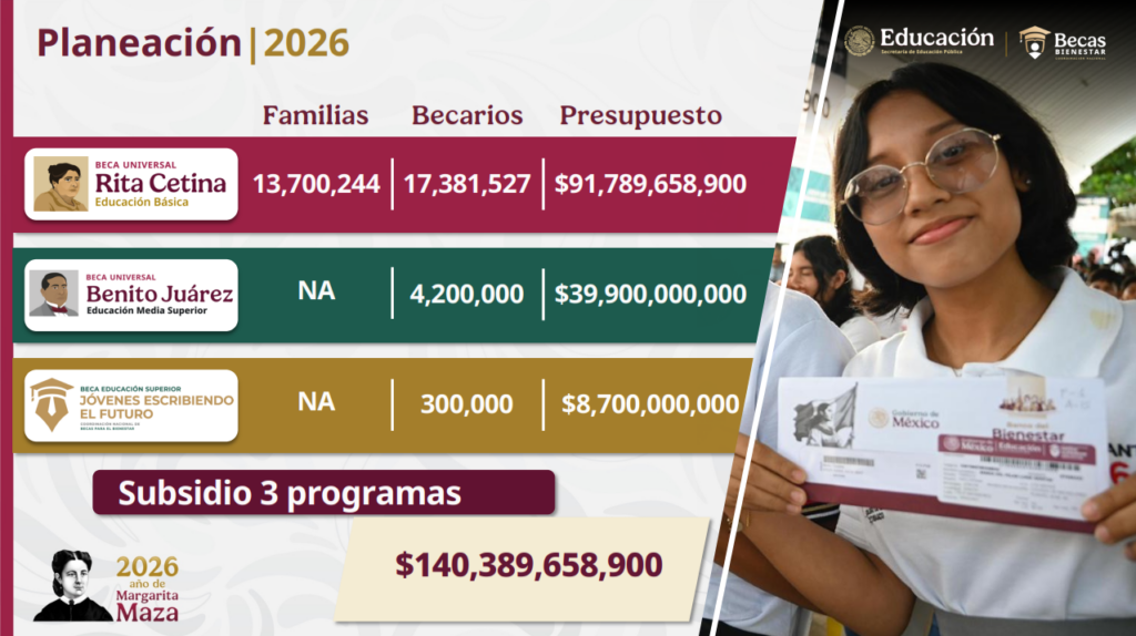 Este lunes 9 de febrero de 2026, durante la conferencia matutina, la presidenta de México, Claudia Sheinbaum Pardo, destacó que, cuando no hay corrupción, hay recursos suficientes para destinarlos a la gente. Debido a ello, este año destinaron un billón de pesos para los Programas para el Bienestar, incluidas las becas para estudiantes de escuelas públicas. Dichos apoyos registraron un crecimiento de 216 por ciento, al pasar de 7.2 millones de becarios en 2019, a 22.8 millones en 2026, con un presupuesto total de más de 140 mil 389 millones 658 mil 900 pesos.