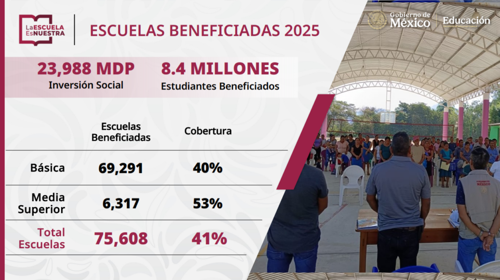 La titular del programa “La Escuela es Nuestra”, Pamela López, detalló que, en 2026, este programa tiene un presupuesto de 26 mil mdp para beneficiar a 9.5 millones de estudiantes de 78 mil 923 escuelas. Entre éstas, 72 mil 831 son de Educación Básica y seis mil 92 de Media Superior. Informó que, de enero a marzo, los Servidores de la Nación visitarán las escuelas para realizar las asambleas, de abril a mayo entregarán las tarjetas y, en mayo, realizarán el pago correspondiente.