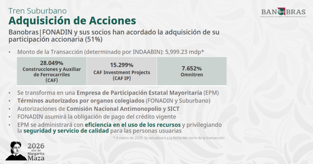 El titular de Banobras, Jorge Mendoza Sánchez, declaró que la adquisición del Tren Suburbano representa una inversión de cinco mil 999 millones de pesos. Con ello, Banobras, Fonadin y sus socios, tendrán una participación accionaria del 100 por ciento. Y se convertirá en una Empresa de Participación Estatal Mayoritaria (EPM).