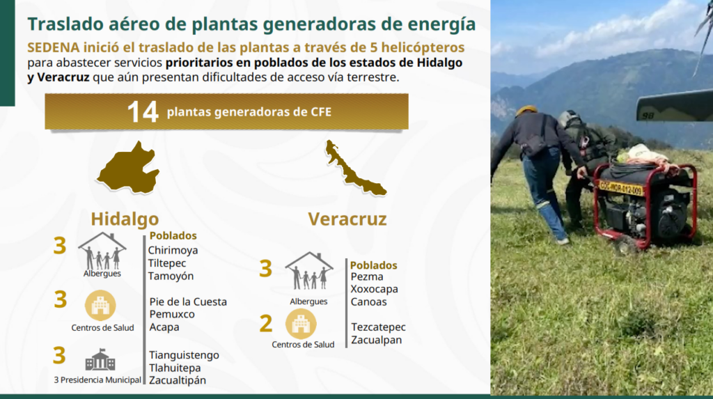 Añadió que, como parte del trabajo coordinado entre las diferentes dependencias del Gobierno de México, la Secretaría de la Defensa Nacional apoyó en el transporte (a través de cinco helicópteros) de las plantas generadoras. De éstas, nueve se distribuyeron en Hidalgo y otras cinco en Veracruz.
