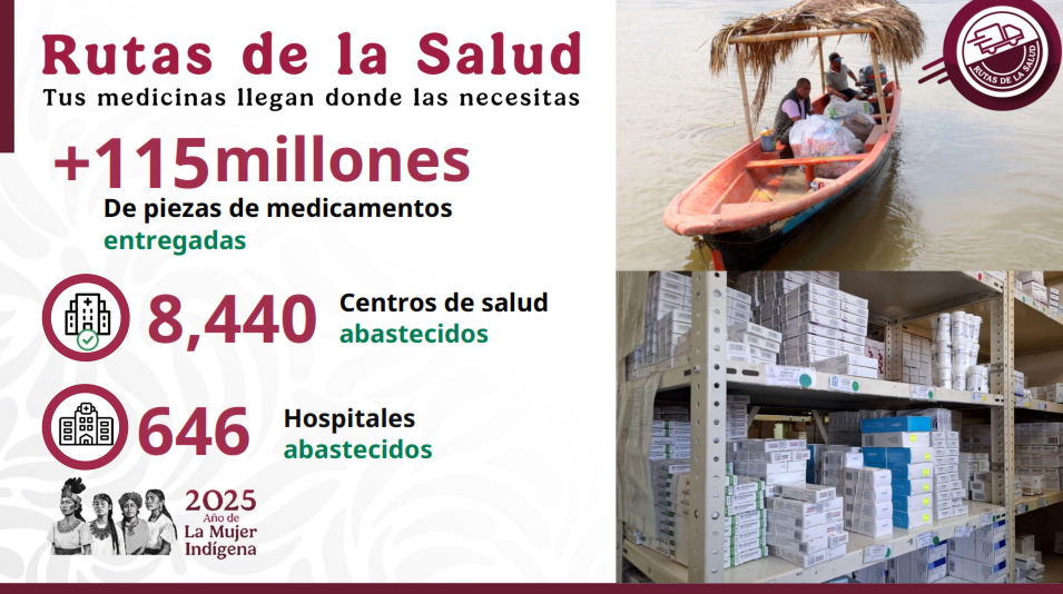 El titular del IMSS-Bienestar, Alejandro Svarch, compartió que, desde su puesta en marcha el 6 de diciembre, las Rutas de la Salud ya entregaron más de 115 millones de piezas de medicamentos. Así como también abastecieron a ocho mil 440 Centros de salud y 646 hospitales. Añadió que, como parte de una cuarta entrega, 325 Rutas de la Salud abastecieron a 640 hospitales con más de 14 millones de piezas, garantizando insumos para cirugías y tratamientos especializados.