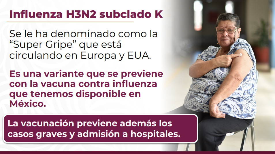El titular de la Secretaría de Salud, David Kershenobich, declaró que, en atención a la alerta emitida por la Organización Mundial de la Salud (OMS) sobre la influenza H3N2 subclado K, también denominada como la “Super Gripe”, que circula en Europa y Estados Unidos, en México sólo hay un caso registrado en una mujer de 82 años. La paciente recibió tratamiento en el Instituto Nacional de Enfermedades Respiratorias (INER). El secretario señaló que la influenza H3N2 subclado K se trata de una variante que responde bien al tratamiento habitual. Y se previene con la vacuna Mexinvac que se produce en el país y de la que hay una disponibilidad suficiente para cubrir a la población en riesgo.