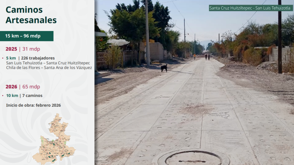 Asimismo, informaron que destinan 96 mdp para la construcción de 15 km de caminos artesanales de los cuales, en 2025, iniciaron con los primeros cinco km, con 226 trabajadores. Y, en 2026, serán 10 km para siete caminos cuyos trabajos comenzarán en febrero. Sobre el “MegaBachetón”, indicó que son mil 228 mdp para pavimentar 381 km, bachear mil 134 km y colocar señalamientos en dos mil 279 km. Además, llegará un tren de repavimentación al estado. En Infraestructura Educativa, en 2026 construirán el Bachillerato Tecnológico San Andrés Cholula y la Universidad Nacional Rosario Castellanos (UNRC) en la Zona Metropolitana de la entidad.