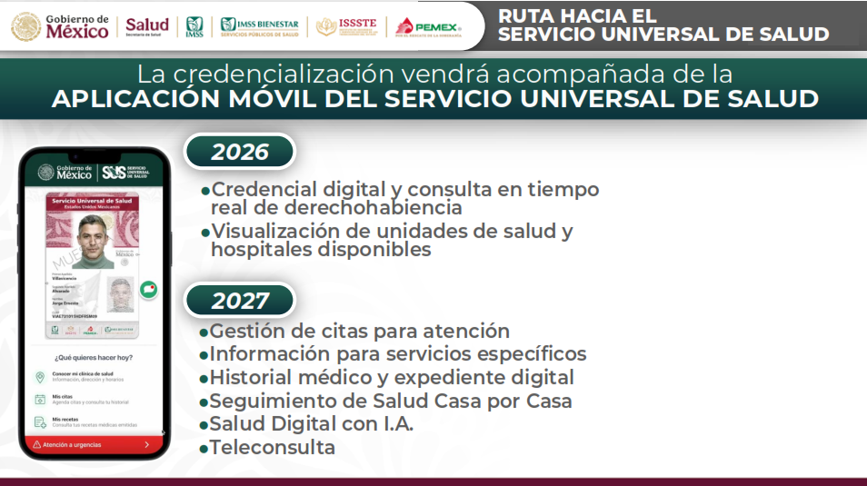 Resaltó que la credencialización vendrá acompañada de una aplicación móvil que en 2026 permitirá acceder a una versión digital de la credencial, consultar en tiempo real la derechohabiencia y la visualización de unidades de salud y hospitales disponibles. Para 2027 permitirá gestionar citas; información para servicios específicos; historial médico y expediente digital; seguimiento de Salud Casa por Casa; salud digital con IA y teleconsulta.