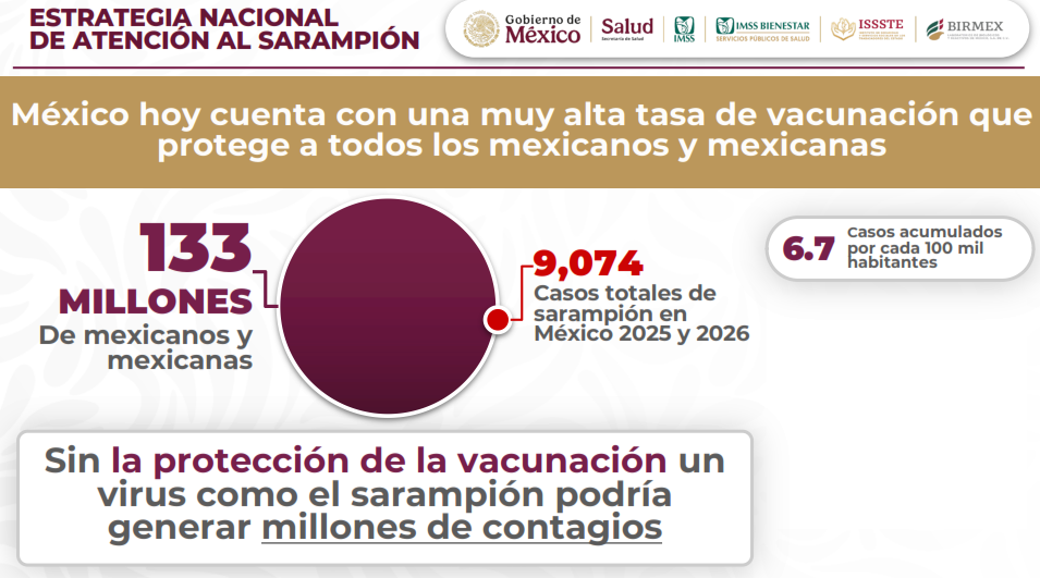 Por su parte, el subsecretario de Políticas de Salud y Bienestar Poblacional, Ramiro López Elizalde, externó que, entre 2025 y 2026, con la Estrategia para controlar el sarampión se han aplicado 14.3 millones de vacunas, comparado a las cinco y seis millones que se aplican en un año normal sin brote. “Para tranquilidad de todos: tenemos las suficientes vacunas para proteger a la población”, remarcó.