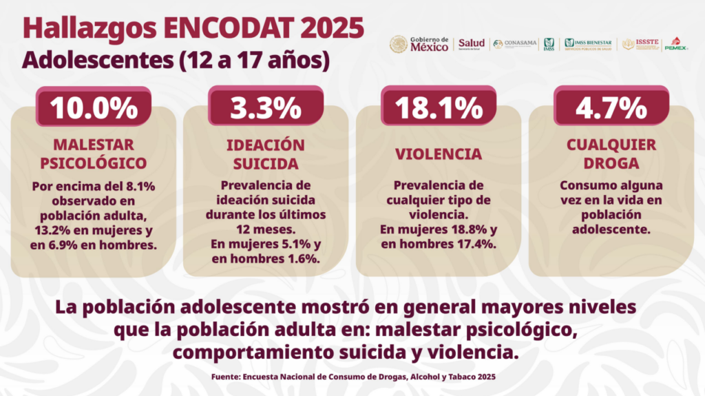 El titular de la Secretaría de Salud federal, David Kershenobich, indicó que la Encuesta Nacional de Consumo de Drogas, Alcohol y Tabaco (ENCODAT) 2025, reveló que el 10 por ciento de los jóvenes, de entre 12 y 17 años, muestran malestar psicológico. Mientras que el 3.3 por ciento, ideación suicida; el 18.1 por ciento tiene exposición a cualquier tipo de violencia; y el 4.7 por ciento consumieron algún tipo de droga en un momento de su vida.