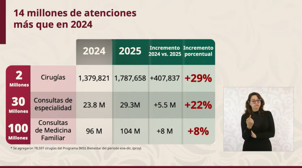 Señaló que actualmente se realizan 60 por ciento más cirugías que en 2018. Es decir, 670 mil cirugías adicionales. En el caso de las consultas de especialidad, se incrementó en cerca de 10 millones más que en 2018. Ello significa un incremento del 48 por ciento; en consultas de medicina interna, 18.3 millones más que en 2018. Lo cual representa 21 por ciento más. Anunció que, para 2026 la meta es realizar 2.15 millones de cirugías, 32 millones de consultas de especialidad y 108 millones de Medicina Familiar.