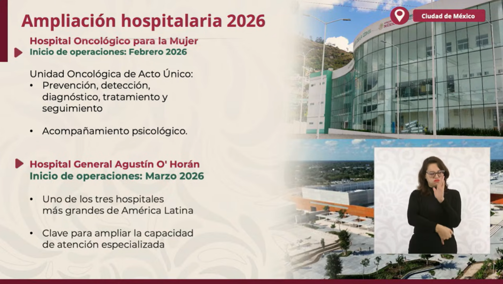 El objetivo para el 2026 es realizar una ampliación hospitalaria con el Hospital Oncológico para la Mujer en la Ciudad de México, que iniciará operaciones en febrero; el Hospital General Agustín O’ Horán en Mérida, Yucatán, en marzo; el Hospital General de Ciudad Madero, Tamaulipas, en marzo. Así como el Hospital General de Jiutepec, Morelos, en febrero. Sobre el abasto de medicamentos, con las Rutas de la Salud, en los últimos cuatro meses de 2025, entregaron más de 115 millones de piezas, logrando el abasto mensual de ocho mil 440 Centros de Salud y 646 hospitales del IMSS Bienestar.