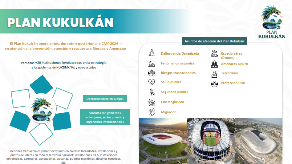 Sobre lo anterior, el titular de la Secretaría de Seguridad y Protección Ciudadana (SSPC), Omar García Harfuch, explicó que el “Plan Kukulkán” integra a más de 20 dependencias federales y contempla la coordinación con autoridades de Jalisco, Nuevo León y Ciudad de México. Así como mecanismos de cooperación internacional con Estados Unidos, Canadá y la Federación Internacional de Fútbol Asociación (FIFA). De igual manera, indicó que se instaló una Mesa de Coordinación estratégica con representantes de FIFA.