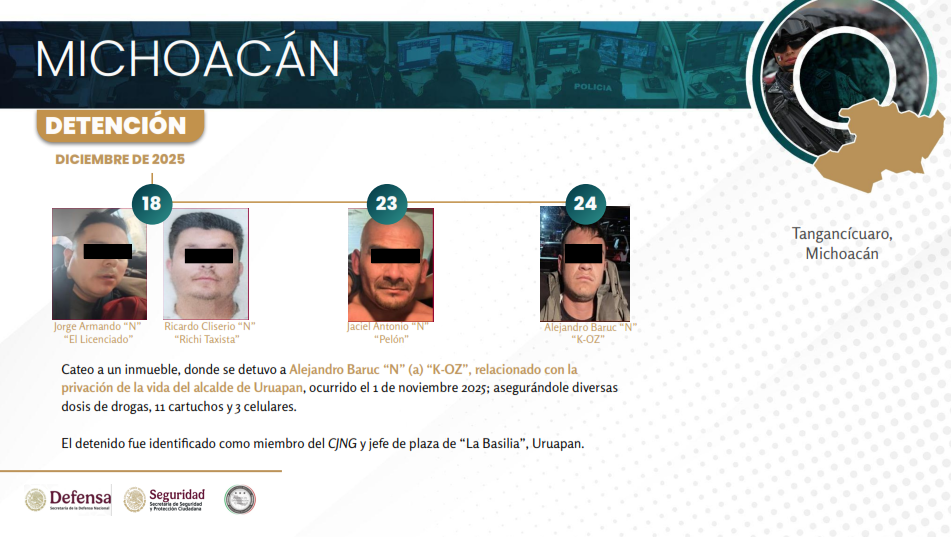 Lo que se presenta públicamente como una lista cronológica de detenciones es, en realidad, el mapa de una célula criminal desarticulada pieza por pieza. Un esquema de cooperación que involucró a las fiscalías generales de la República y del estado, las secretarías de la Defensa Nacional, de Marina y de Seguridad, siguió un rastro que comenzó con la muerte (en la escena) del autor material, identificado como Víctor Manuel “N”. Y, recientemente, con la captura, en Nochebuena, de Alejandro Baruc “N”, alias “K-OZ”.