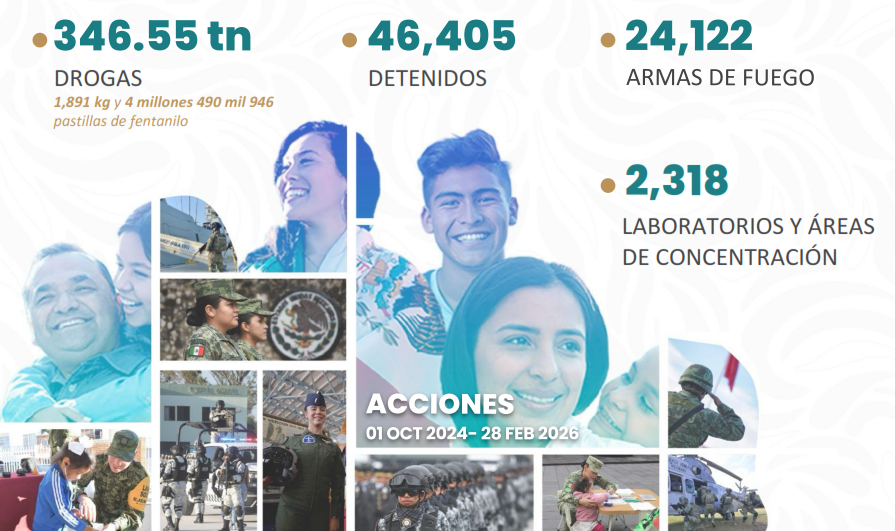 Por su parte, el titular de la Secretaría de Seguridad y Protección Ciudadana, Omar García Harfuch, detalló que, con la Estrategia Nacional de Seguridad, del 1 de octubre de 2024 al 28 de febrero de 2026, detuvieron a 46 mil 405 personas por delitos de alto impacto. Además, aseguraron 24 mil 122 armas de fuego, 346.55 toneladas de droga y desmantelaron dos mil 318 laboratorios clandestinos y áreas de concentración para la producción de metanfetaminas.