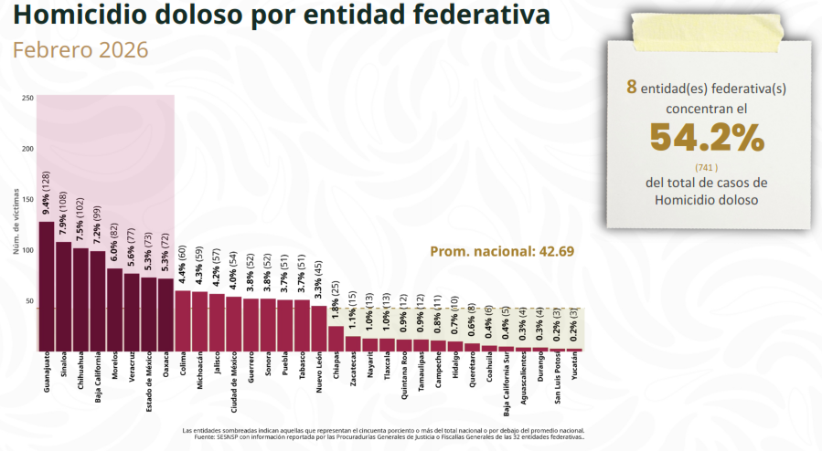 En su intervención, la titular del Secretariado Ejecutivo del Sistema Nacional de Seguridad Pública, Marcela Figueroa Franco, señaló que, entre 2025 y 2026, el promedio diario de homicidios dolosos presentó una reducción del 35 por ciento, al pasar de 75 a 48.8. Y resaltó que, durante febrero de 2026, ocho entidades federativas concentraron el 54.2 por ciento del total de homicidios dolosos: