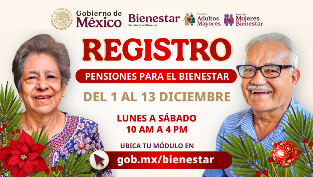 La titular de la Secretaría de Bienestar, Ariadna Montiel Reyes, informó que, del 1 al 13 de diciembre, se abrirá el registro de las Pensiones Bienestar para Adultos Mayores y Mujeres Bienestar. Tendrán un horario de lunes a sábado de las 10:00 a las16:0 horas en los módulos que podrán ubicar en la página de dicha Secretaría.