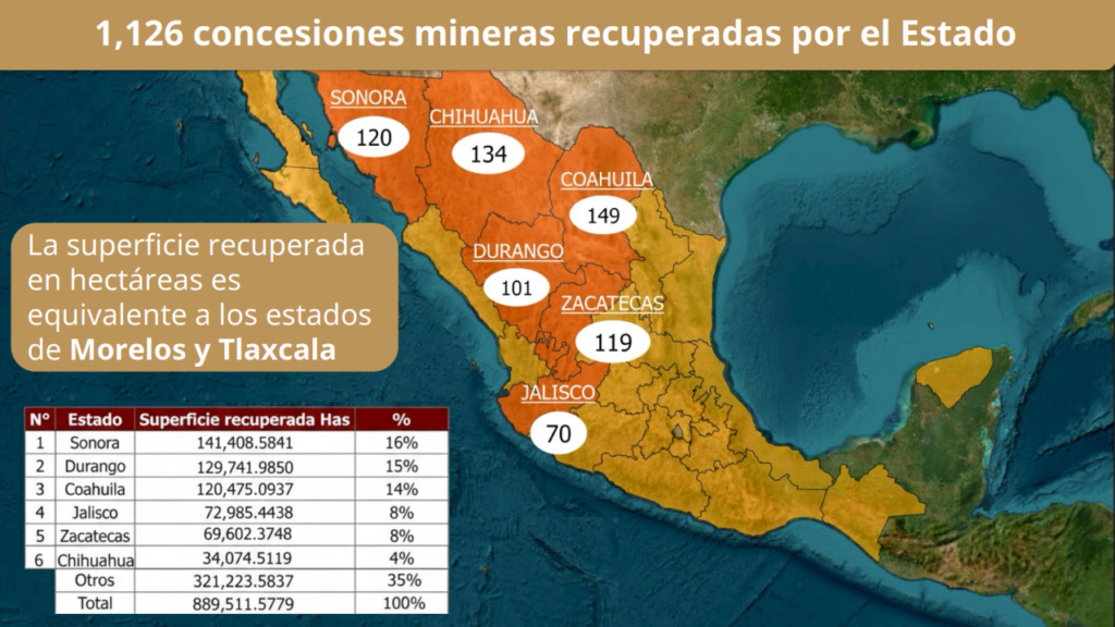 “Aparte de las mil 126 en 889 mil hectáreas, 713 estaban en 249 mil hectáreas de Áreas Naturales Protegidas. Esto es importantísimo, porque se recuperan las concesiones y se garantiza que, en Áreas Naturales Protegidas, no habrá explotación minera. Aparte de que ya estaba determinado por ley, pues ya no hay concesiones. Entonces se recuperan esos predios o esos terrenos”. Explicó la jefa del Ejecutivo federal ante los medios de comunicación.